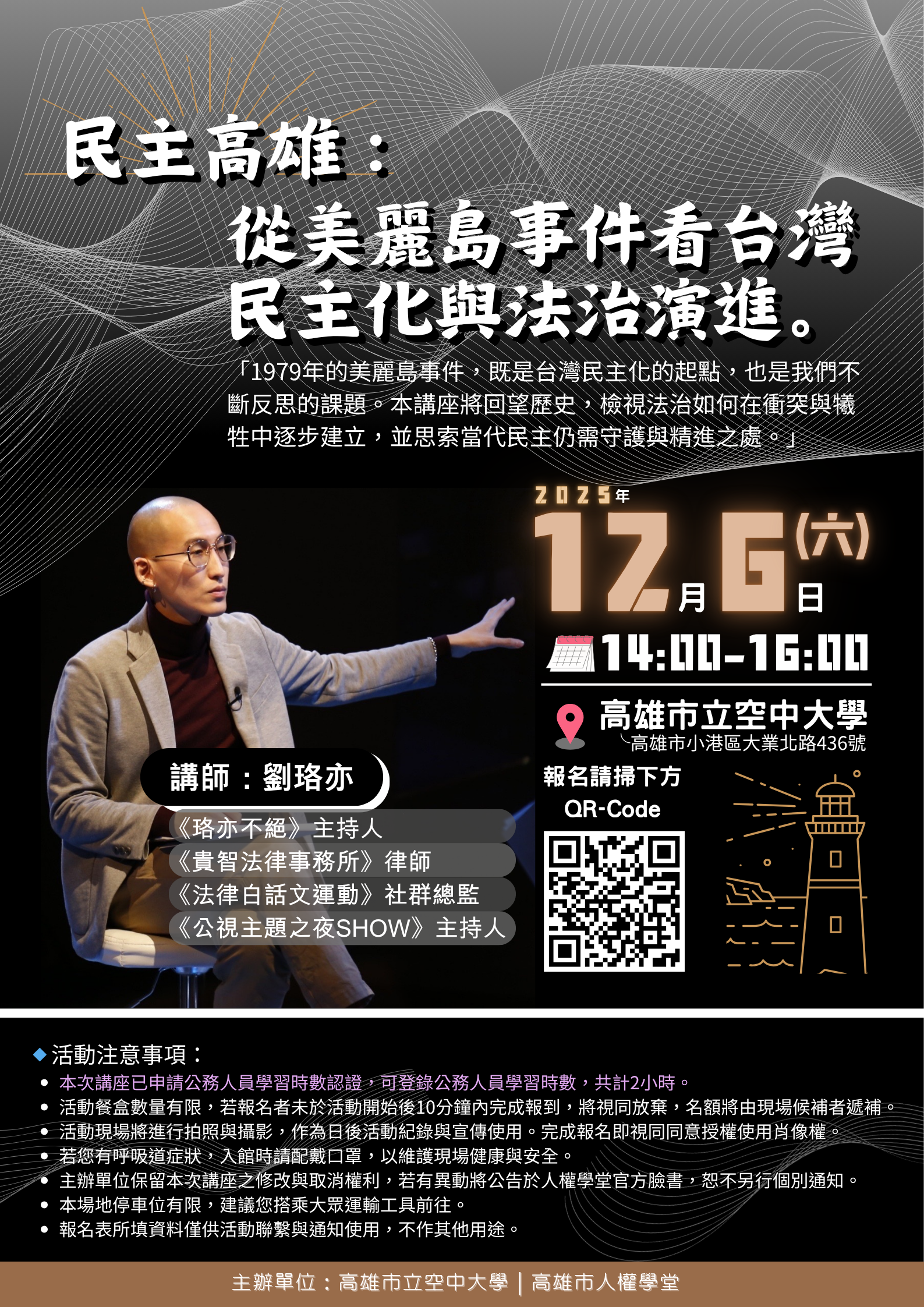 高雄市立空中大學人權學堂12月份辦理之「民主高雄:從美麗島事件看台灣民主化與法治演進」講座,請踴躍報名參與。