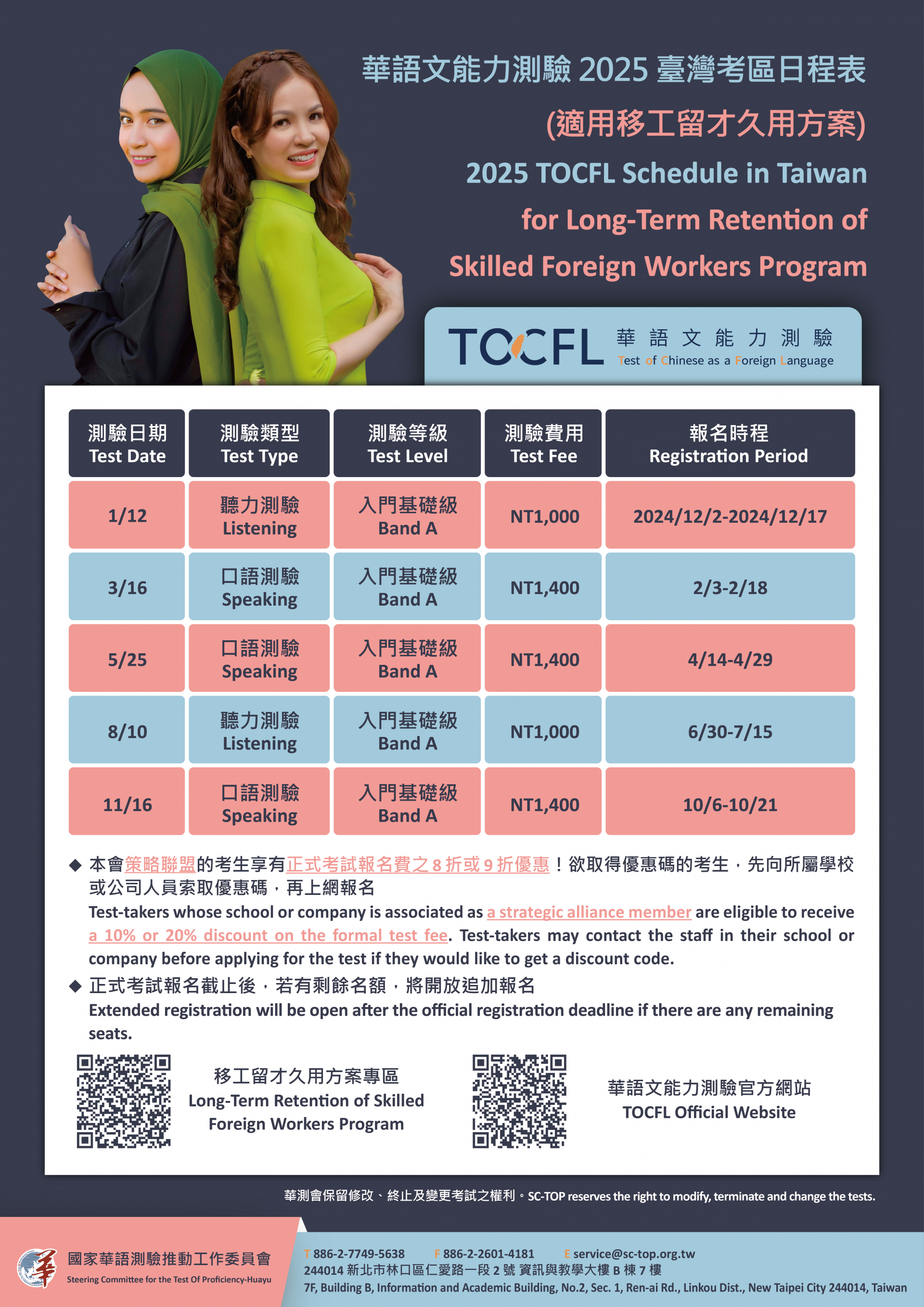 四、為配合勞動部移工留才久用方案, 114 年共舉辦 2 次聽力測驗正式考試及 3 次口語測驗正式考試,皆於週日辦理,相關日程安排及報名費用請見附件。