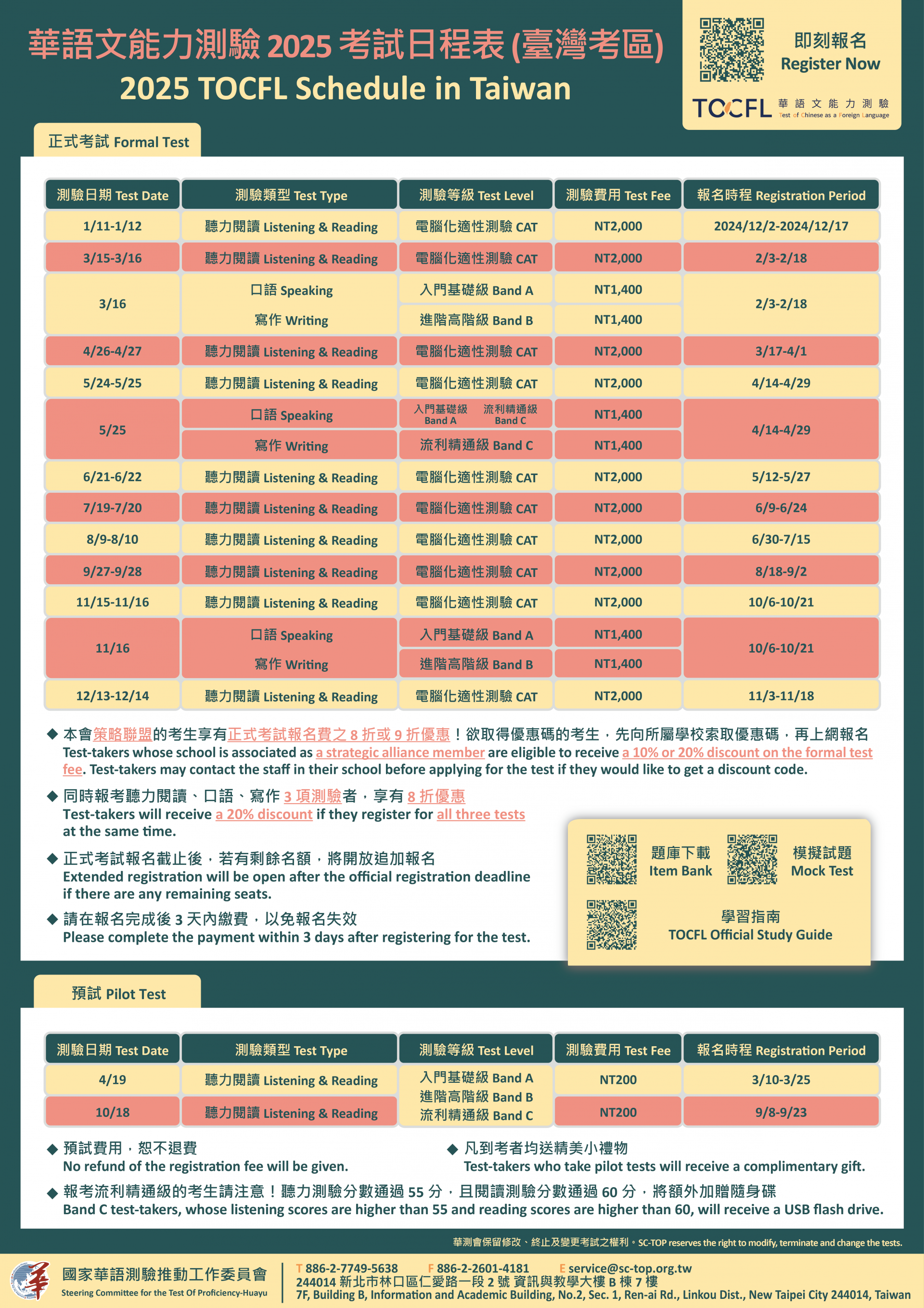 (一) 114 年正式考試日程表: https://tocfl.edu.tw/tocfl/index.php/sign_up/tw/list/1 。