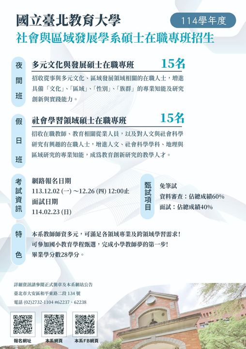 國立臺北教育大學社會與區域發展學系114學年度多元文化與發展碩士班在職專班(夜間)及社會學習領域碩士在職專班(週末假日)招生,敬請踴躍報考。