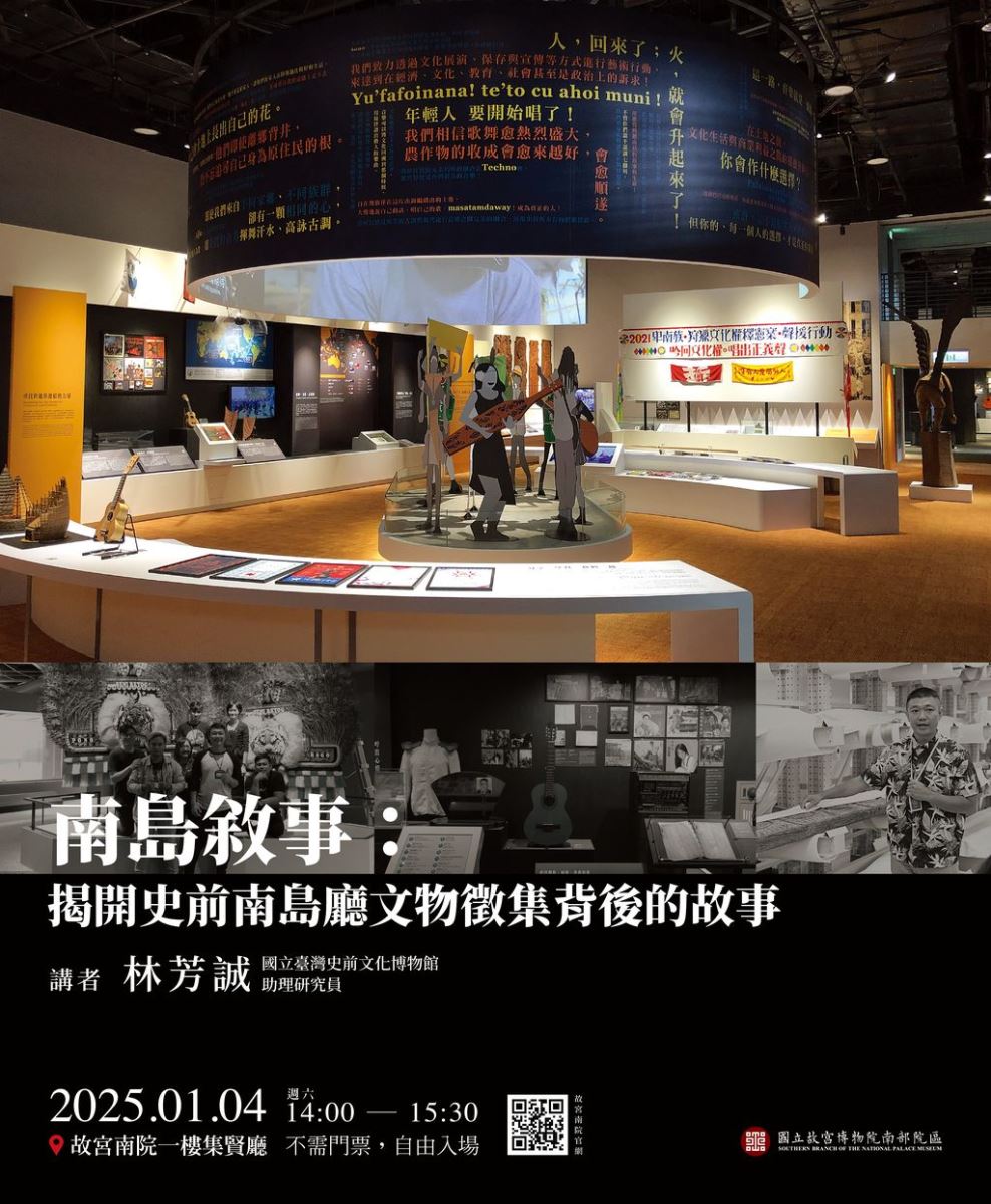 - 內容:分享 2020 年至 2023 年於史前館進行南島常設展廳更新期間,向國內外多個南島文化社群或個人進行文物徵集,以及多媒體影像製作等過程,展現世界南島文化多樣面貌及策展文物詮釋的新穎觀點。