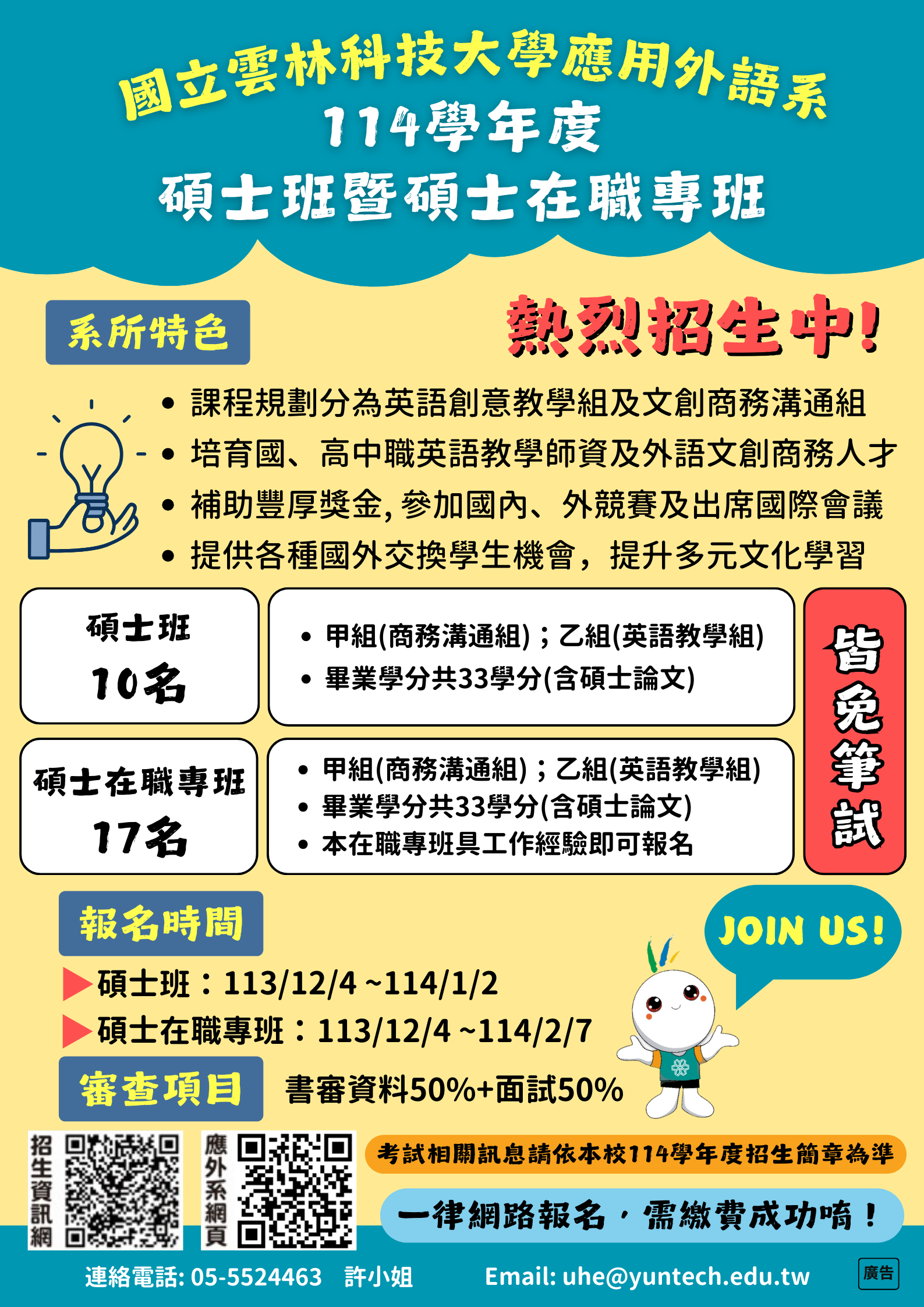 五、招生簡章詳情請至本校應用外語系網頁下載: https://www.dafl.yuntech.edu.tw/depnews_content?id=3083