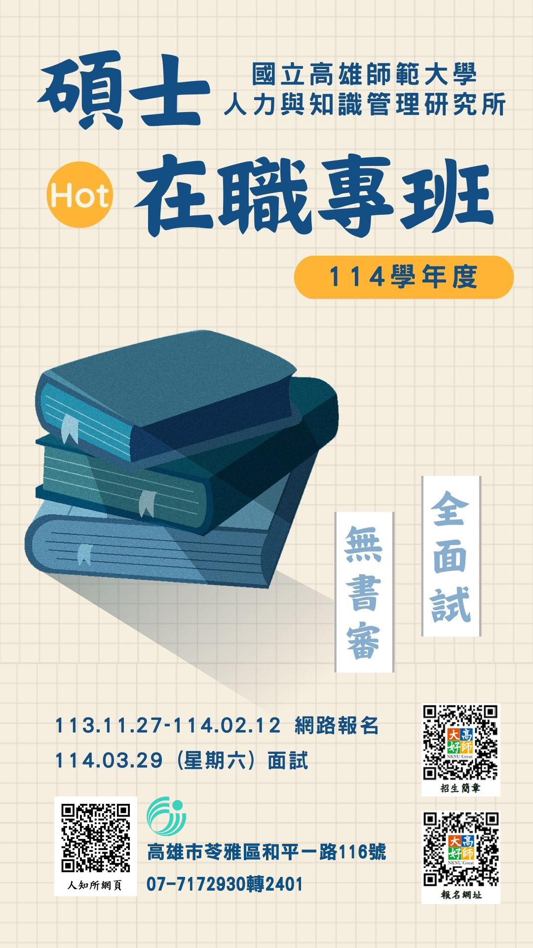 國立高雄師範大學114學年度「人力與知識管理碩士在職專班」招生,敬請踴躍報考。