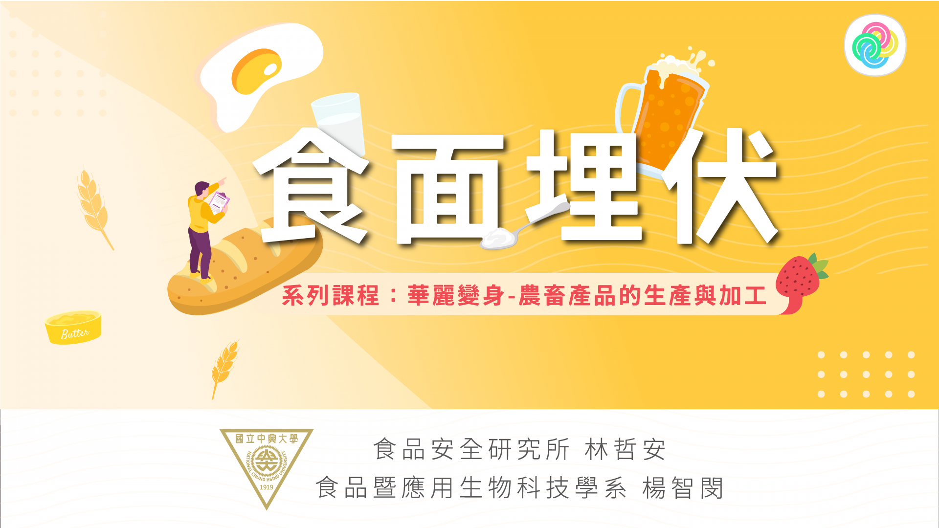 (四)食面埋伏:本課程旨在增進學生食安基本認識,包括食品安全管理基礎知識的認知、理解目前國內食品安全管理之作為、食品安全管理系統認證標章的認識、食品添加物的認知與安全性、食品成分標示內容的認識。課程分為 6 個小單元: 1.創造價值的食品加工技術、 2.淺談食品安全管理、 3.食品添加物面面觀、 4.食品加工技術原理簡介、 5.食品微生物的奧秘與探索、 6.無所不在的食品微生物。