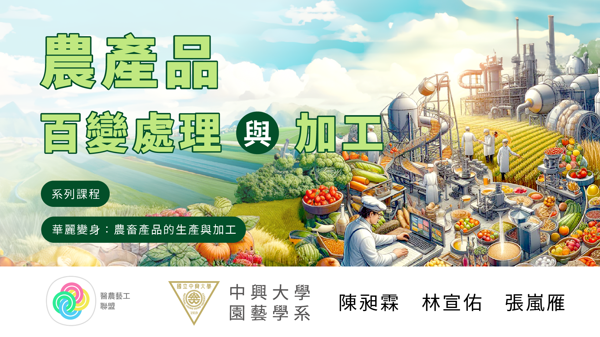 (一)農產品百變處理與加工:本課程將介紹農產品的多樣處理與加工方法,以及對產地到餐桌概念之理解和知識。課程共有 6 個小單元: 1.從產地到餐桌、 2.農產品處理與加工再進化、 3.柿界大不同-甜柿與澀柿、 4.蛻變的風華-更年性果實、 5.濃縮的滋味-果醬、 6.時間成就的風味-乾燥蔬果。