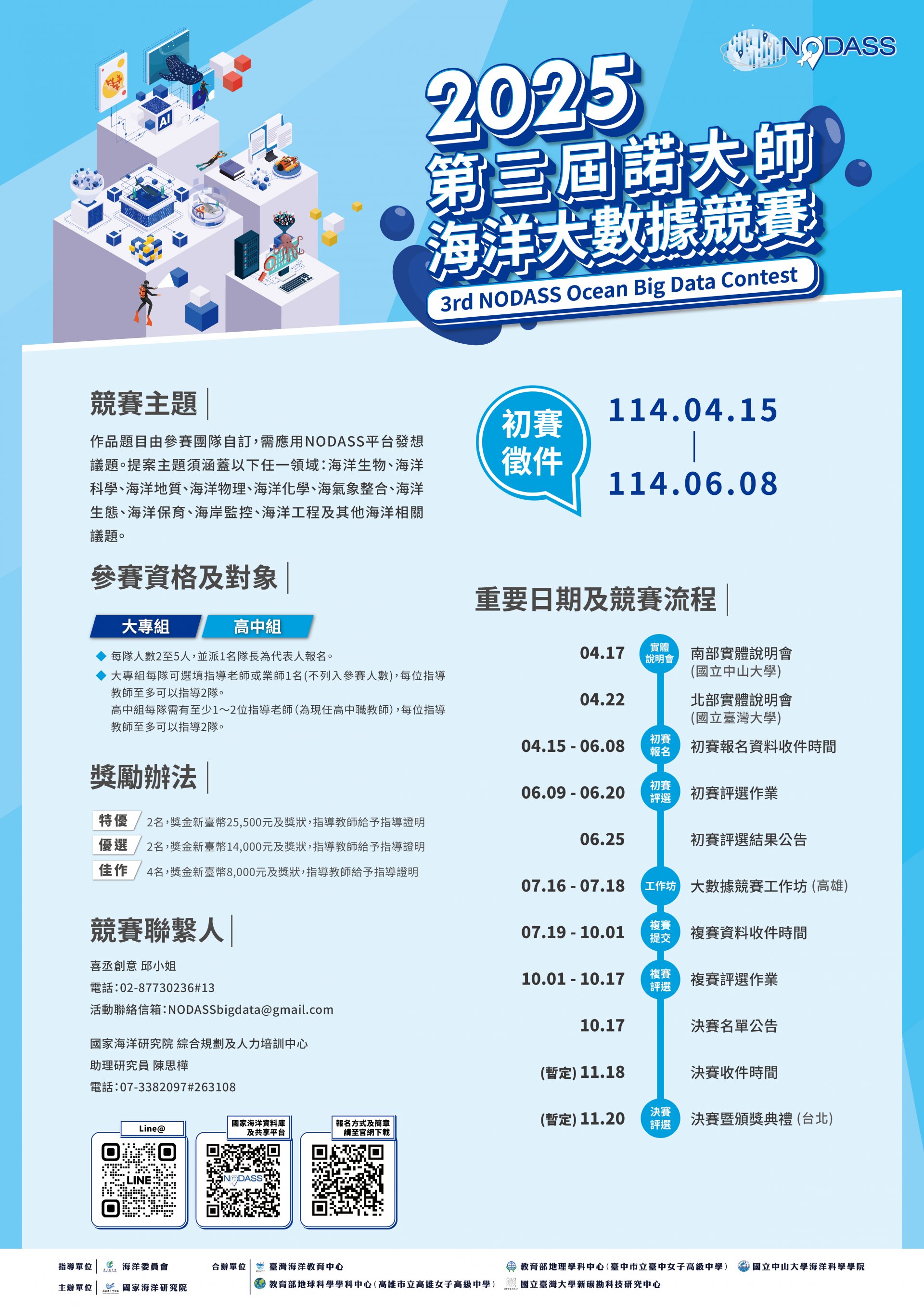 三、請有意參與者自 114 年 4 月 15 日開始至 6 月 8 日(星期日),於活動 網 址 線 上 報 名 及 交 件 ( 網 址 : https://sites.google.com/view/nodassbigdata/index )。
