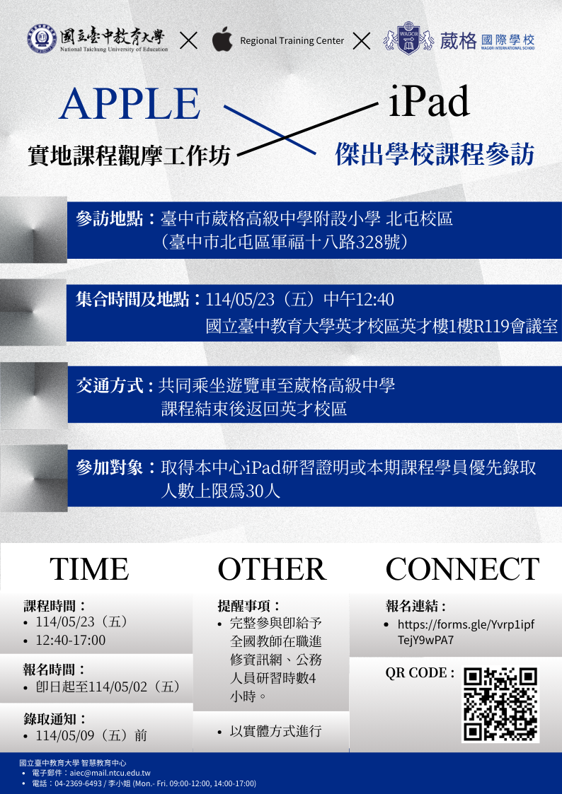 二、如有相關問題請洽聯絡人:智慧教育中心李小姐,電話: 04-23696493 ;電子郵件: aiec@mail.ntcu.edu.tw 。