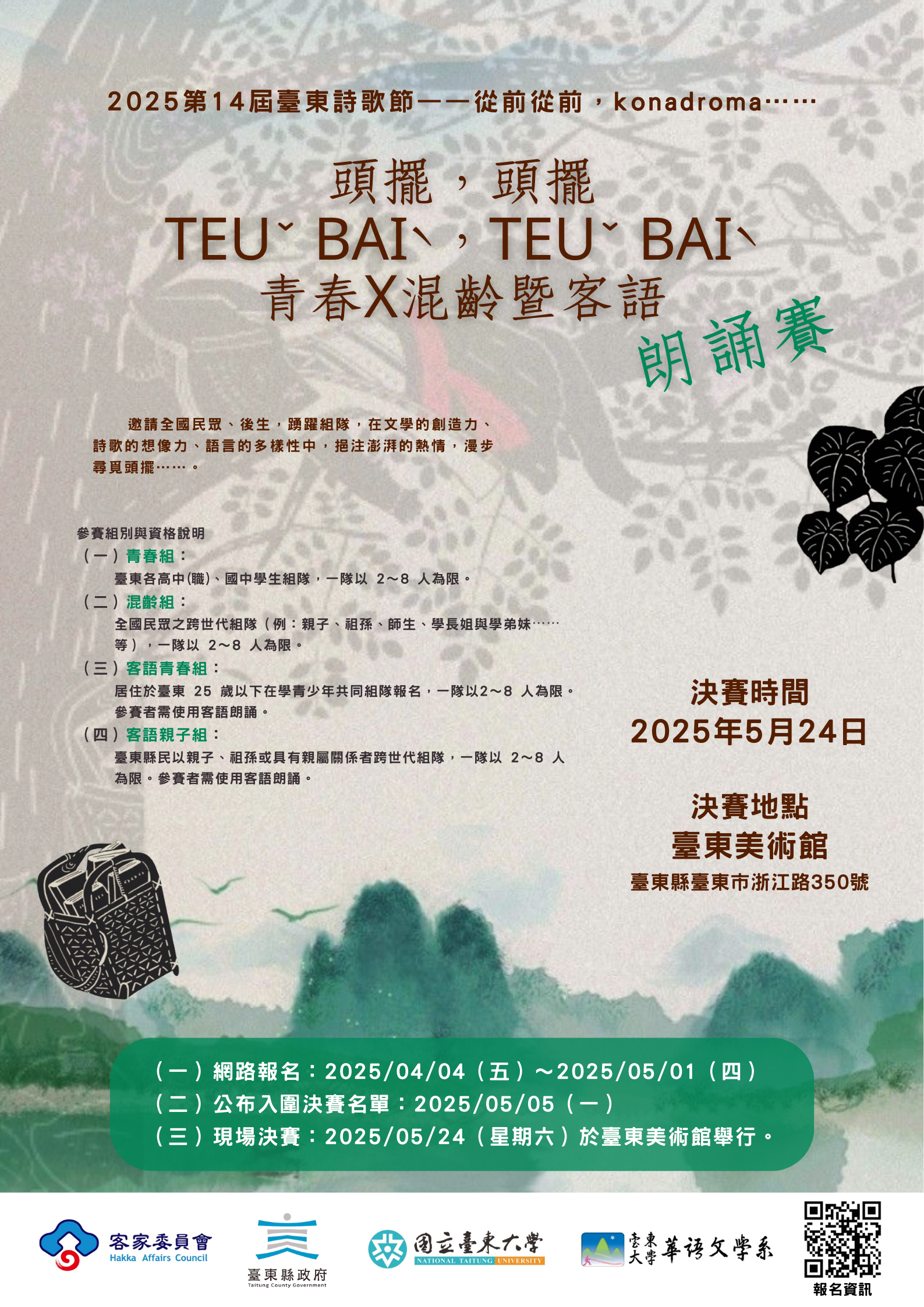 二、第十四屆詩歌節在客家委員會的指導之下,並與臺東縣政府共同舉辦「頭擺,頭擺 teuˇbaiˋ, teuˇbaiˋ,青春╳混齡暨客語朗誦賽」,邀請全國民眾、後生,踴躍組隊,在文學的創造力、詩歌的想像力、語言的多樣性中,挹注澎湃的熱情,漫步尋覓頭擺,頭擺 teuˇbaiˋ, teuˇbaiˋ的流光,編織迤邐成炎炎夏日東海岸盡靚的風景,共創屬於你我的新記憶,好時光。