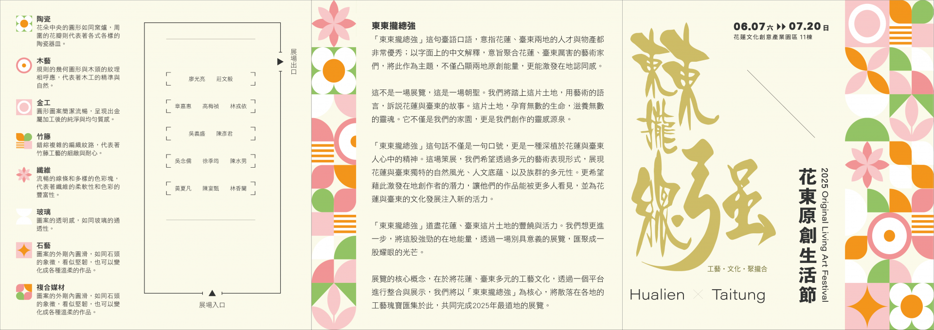 二、國立臺東生活美學館將於 6 月 7 日至 7 月 20 日假花蓮市文化創意產業園區第 11 棟,舉辦「2025 花東原創生活節-東東攏總強」特展,展區規劃 13 位花東工藝師們的原創工藝品展區、工藝師導覽、原創生活市集、音樂彈唱會及手作體驗活動。