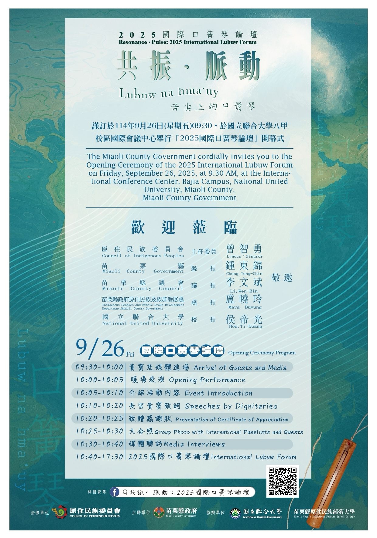 轉知苗栗縣政府將辦理「共振· 脈動:2025國際口簧琴論壇-Resonance · Pulse:2025 International Lubuw Forum」系列活動,敬邀貴單位踴躍參與,請查照。