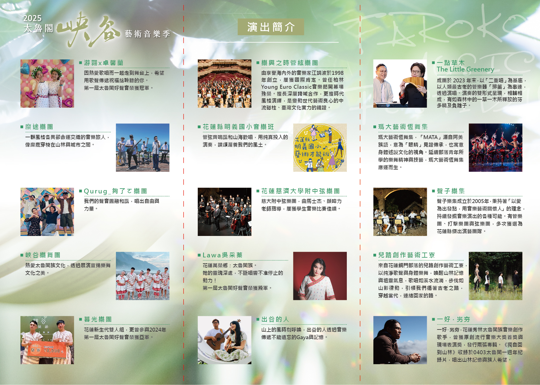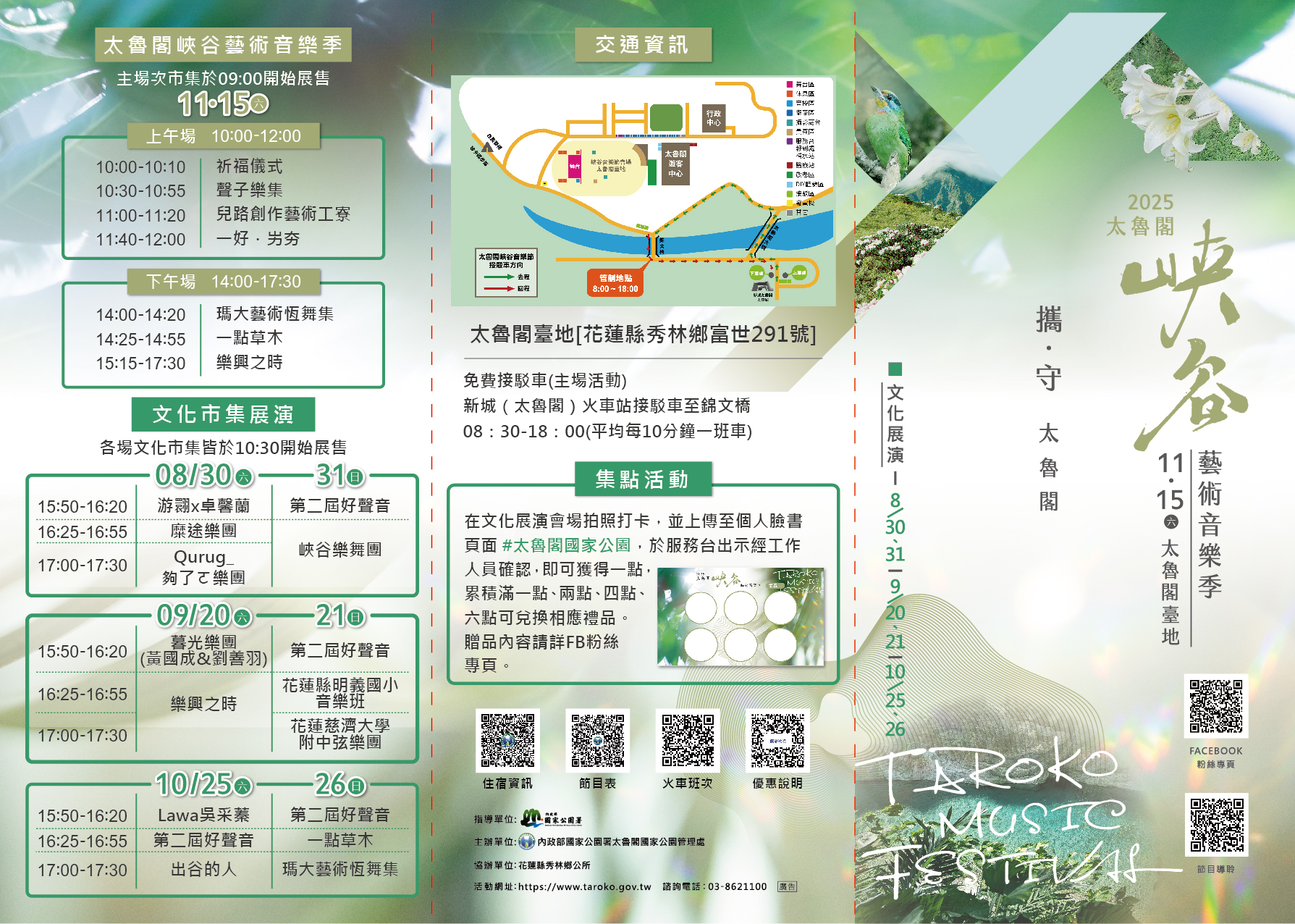 二、「2025 太魯閣峽谷藝術音樂季」將於 114年11 月 15 日(六)上午 09 : 00-下午 17 : 30 於太魯閣臺地登場,有傳統市集及文化展演,免費參加,邀請大家一起到太魯閣『攜‧守太魯閣』。