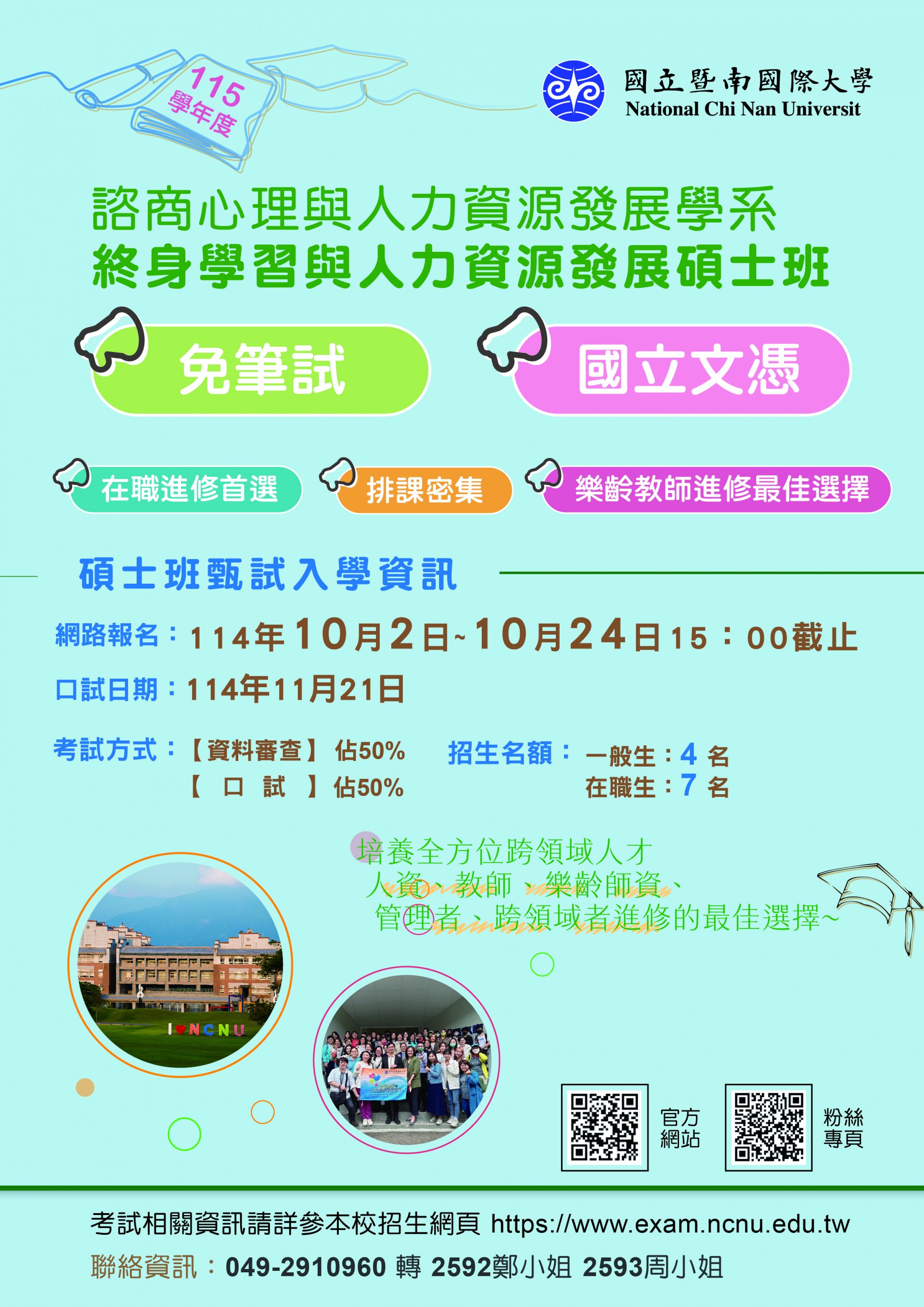 四、網路報名日期 114 年 10 月 2 日至 114 年 10 月 24 日。碩士班甄試名額一般生四名,在職生七名。