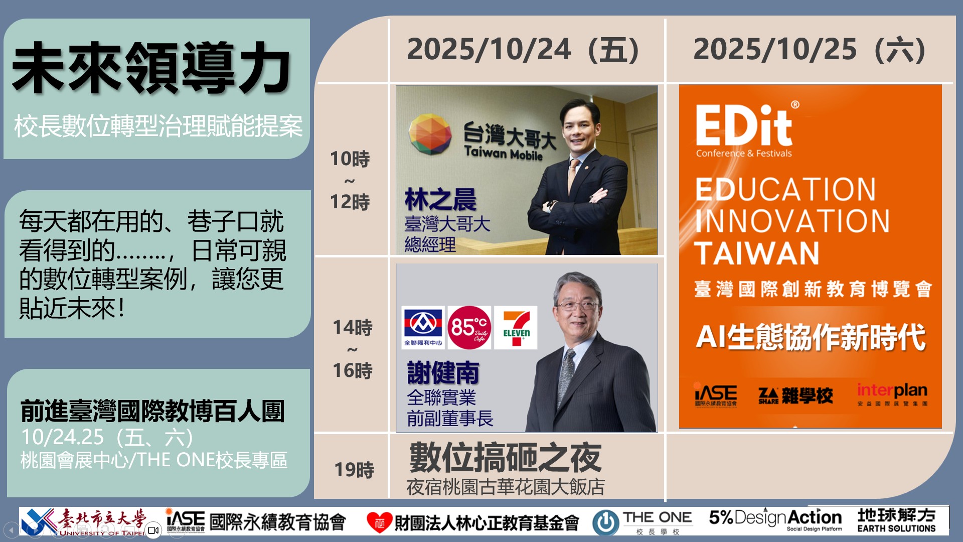 為賦能校長雙軸轉型治理,旨揭團隊訂於 114 年 10 月 24 日(星期五)上午 9 時至 25 日(星期六)下午 17 時辦理相關活動,報名活動對象為全國各縣市高中職國中小及實驗學校現任與候用校長,相關活動地點、報名資料請參閱實施計畫。 |
