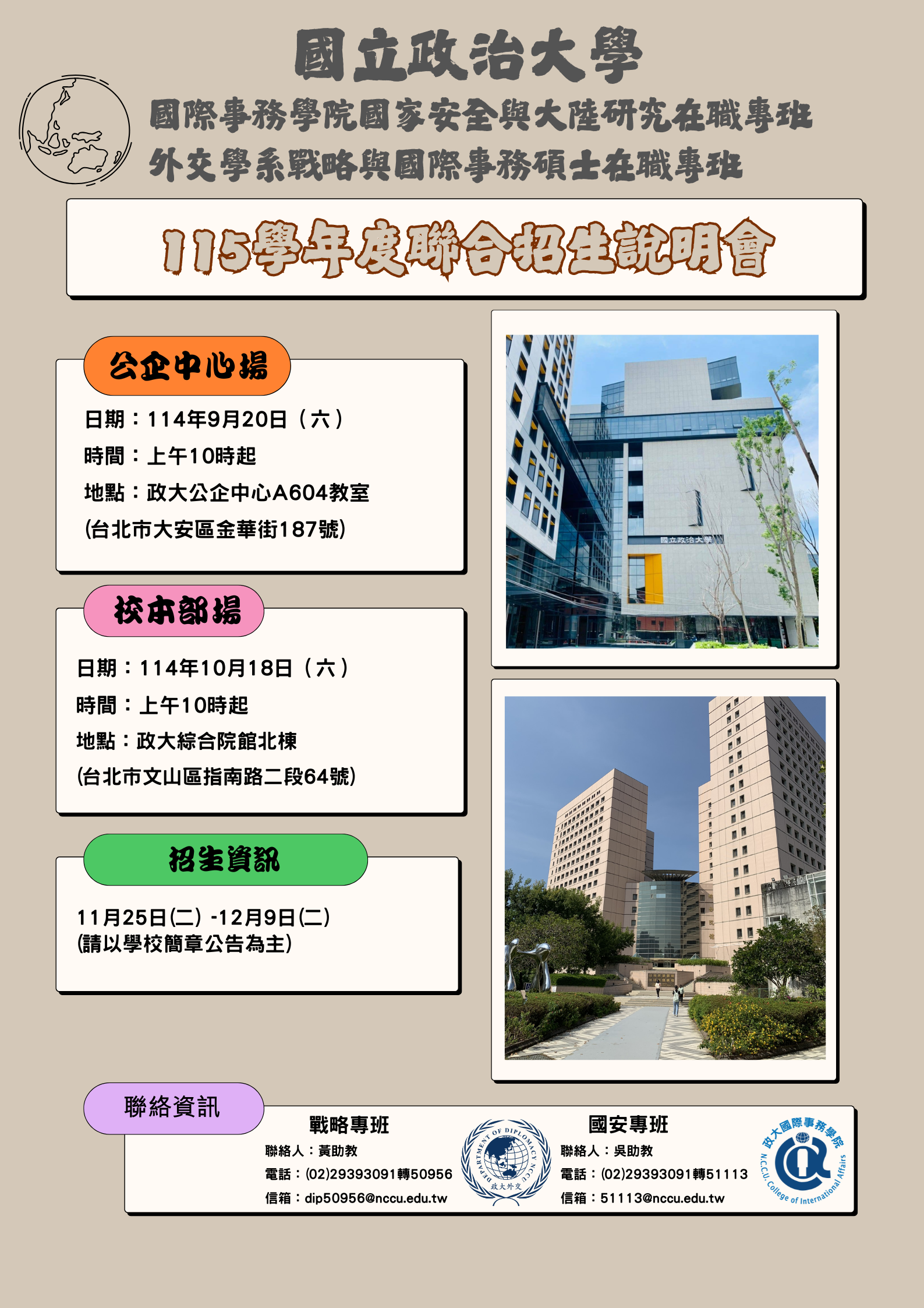 國立政治大學國際事務學院「國家安全與大陸研究碩士在職專班」以及「外交學系戰略與國際事務碩士在職專班」115學年度聯合招生說明會資訊,請踴躍參與。