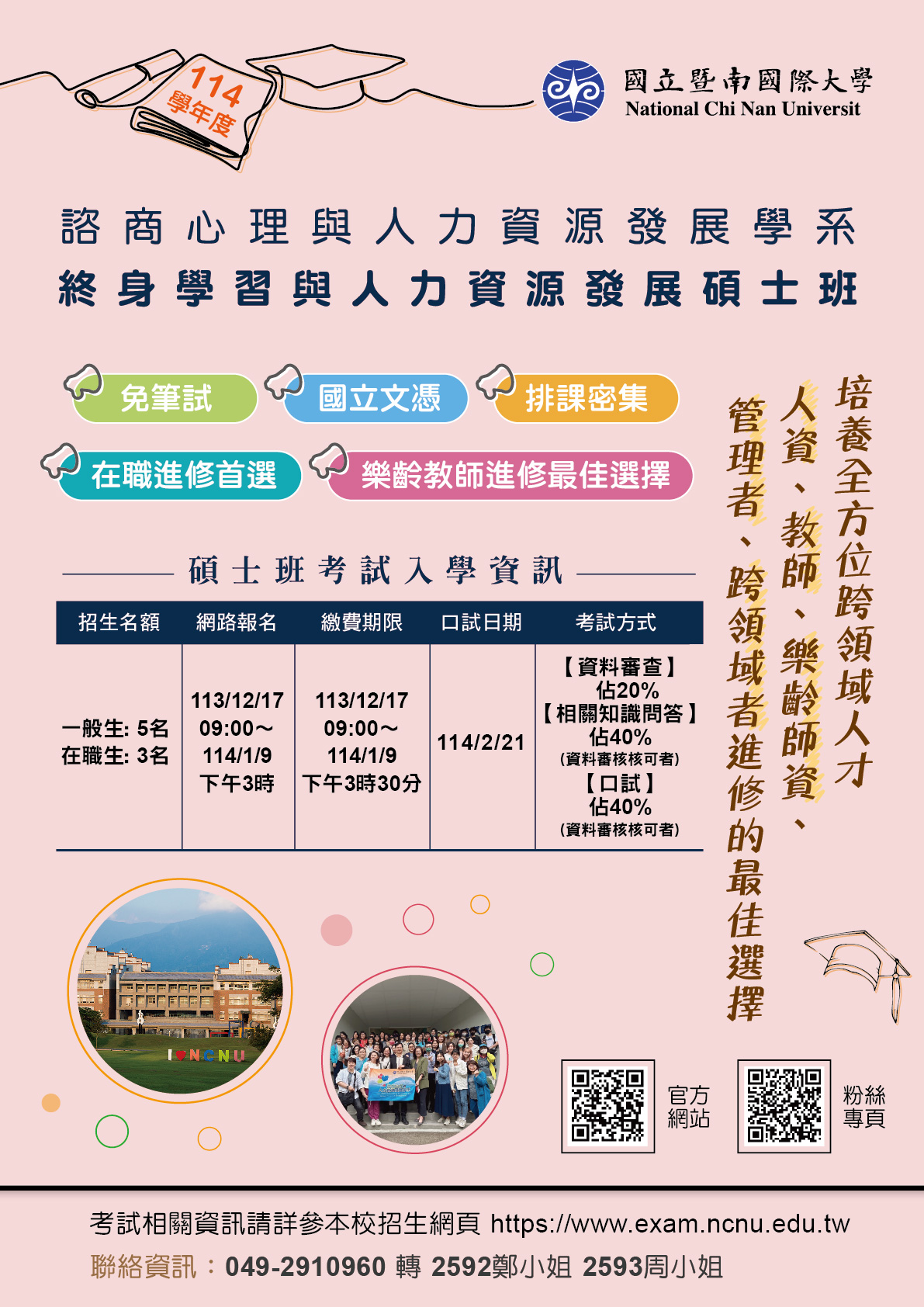 二、網路報名日期 113 年 12 月 17 日至 114 年 1 月 9 日。碩士班入學考試名額一般生五名,在職生三名。口試日期: 114 年 2 月 21 日。
