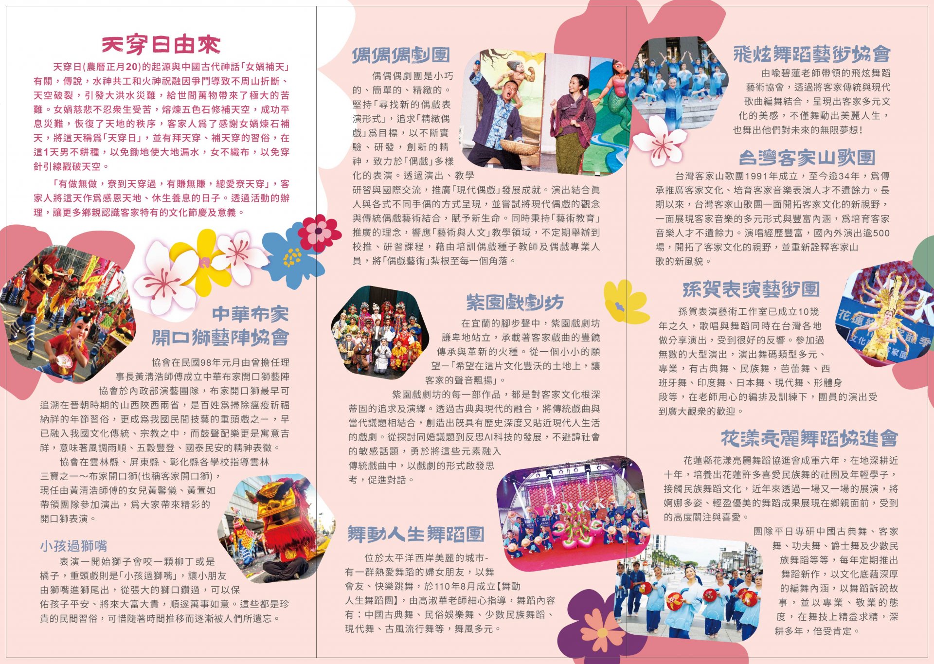 三、活動時間自上午 10 時整至下午 8 時整,現場有女媧補天偶劇、客家開口獅、山歌對唱、客家大戲等豐富多元表演,以及市集、 DIY 體驗區、兒童繪畫比賽等精彩活動,敬請惠予協助宣傳。