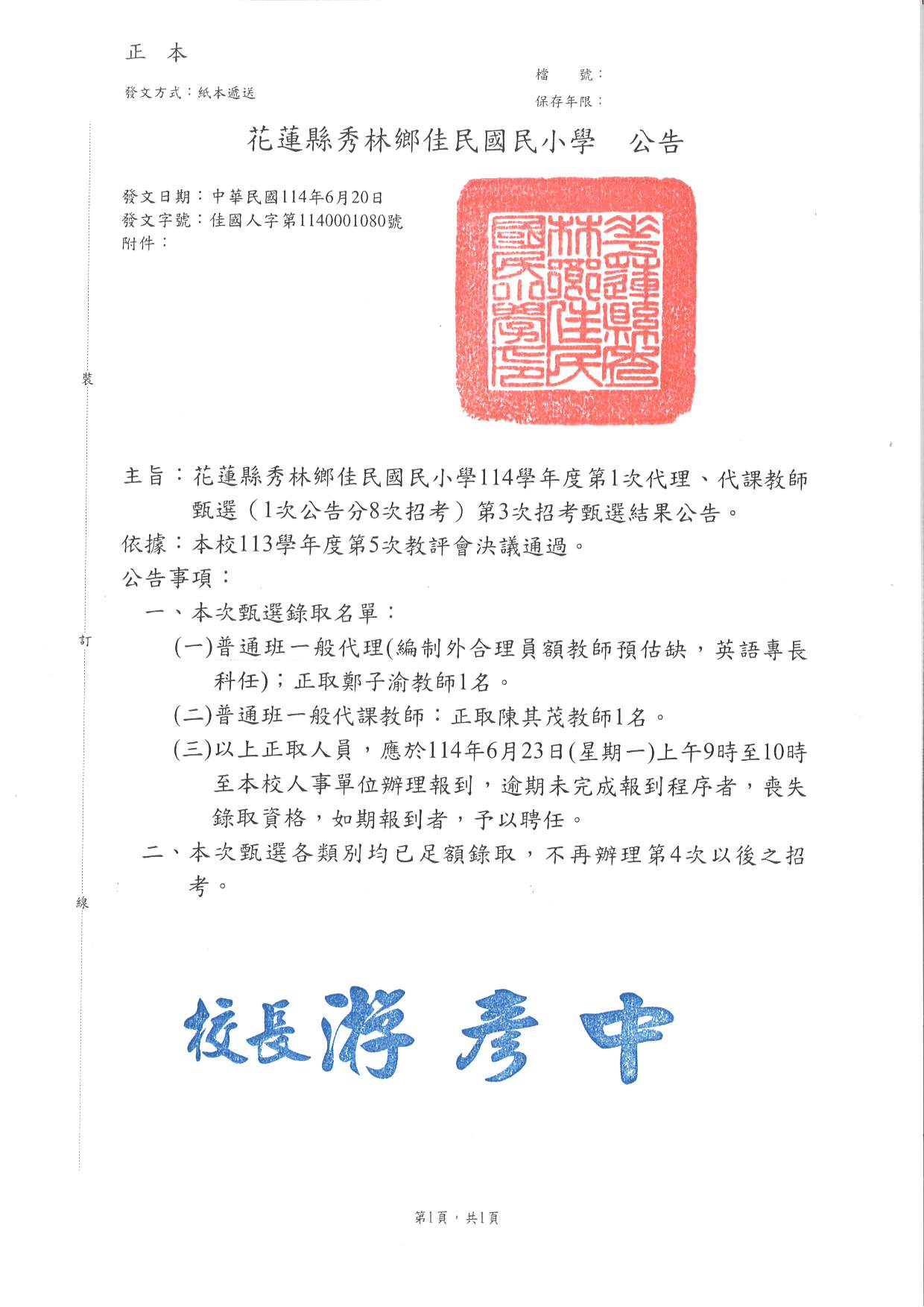 (一)普通班一般代理(編制外合理員額教師預估缺,英語專長 科任);正取鄭子渝教師 1 名。