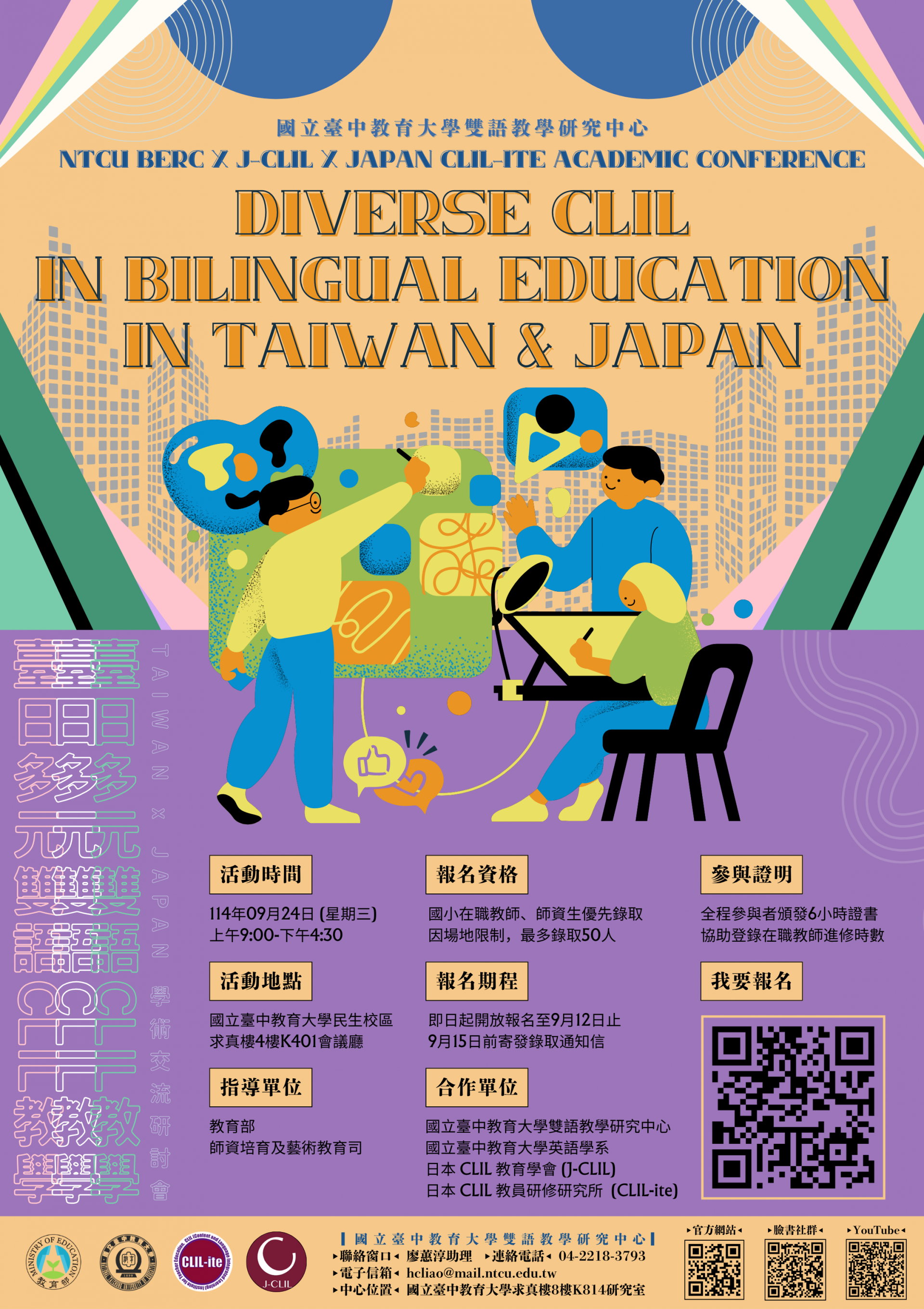 一、研習時間:9/24(三)上午9時至下午16時30分 。 二、研習對象 : 開放有興趣者報名,在職教師及師資生優先錄取,因場地限制至多錄取50人。 三、研習地點 : 國立臺中教育大學求真樓4樓K401會議廳(民生校區) 四、報名方式:請逕至https://forms.gle/hgJ3EBZU3hYvpJnG7報名