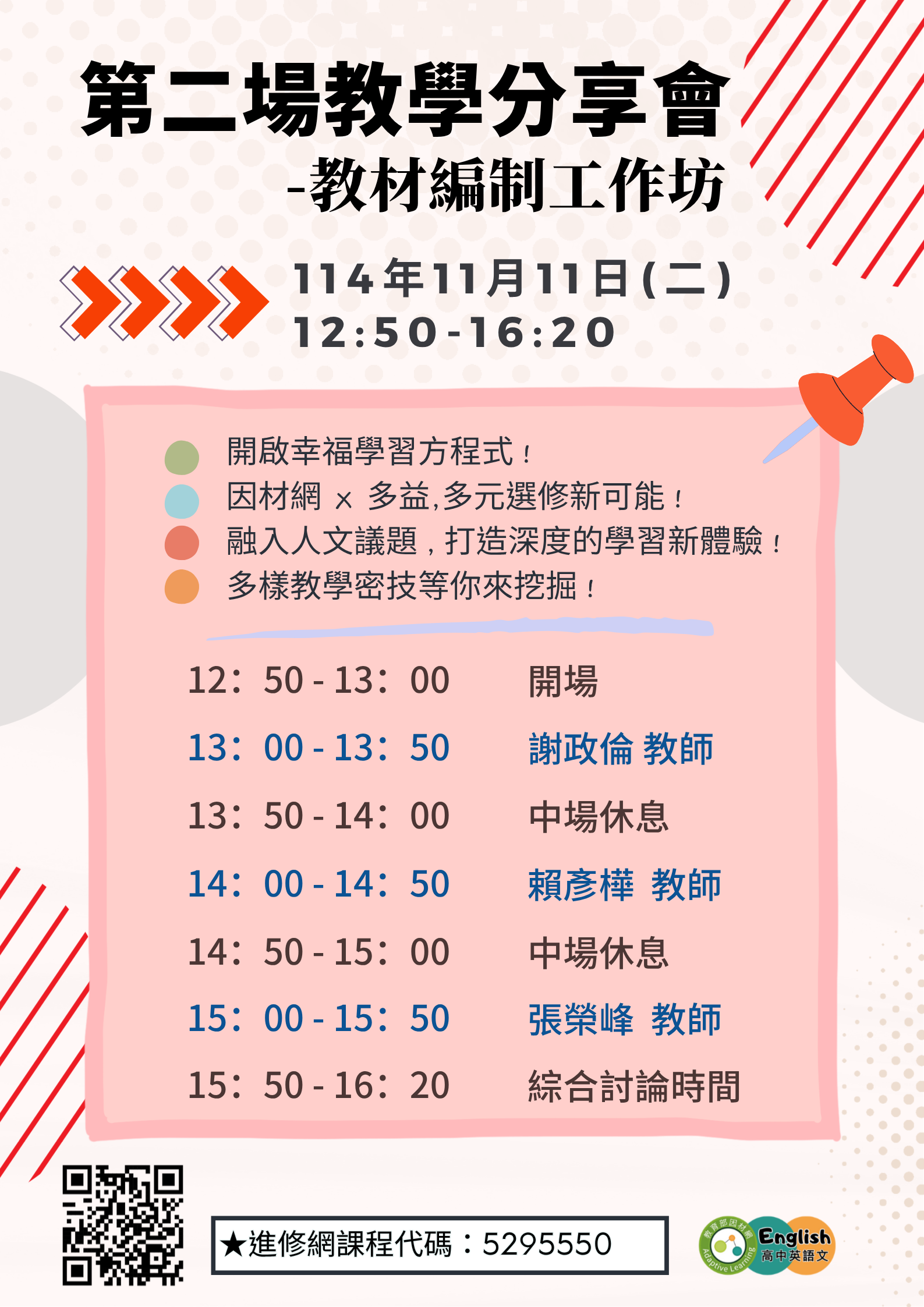七、    報名方式:至「全國教師在職進修網」登錄報名,課程代碼 5295550 。