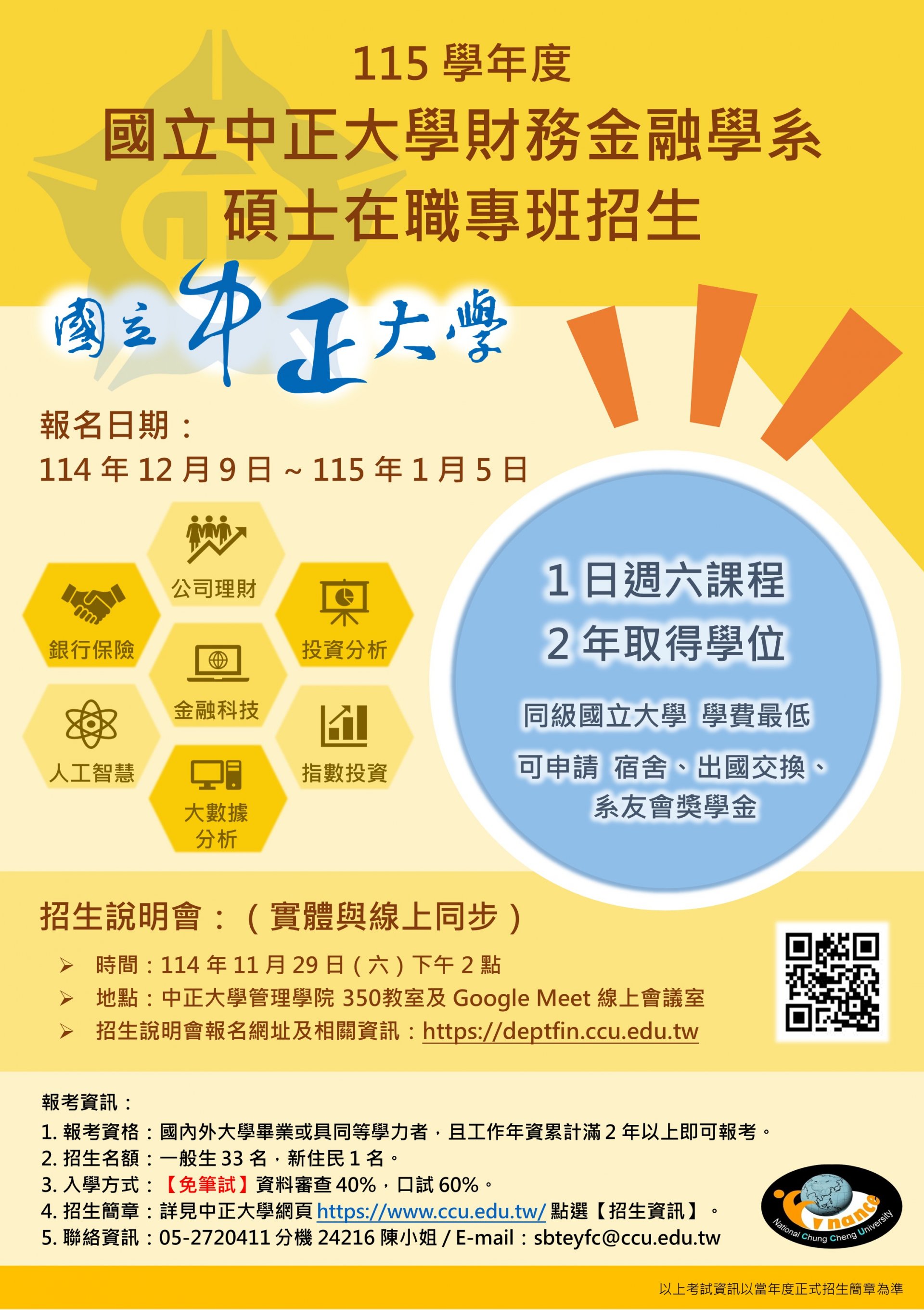 國立中正大學財務金融學系碩士在職專班115學年度招生,請踴躍報考。