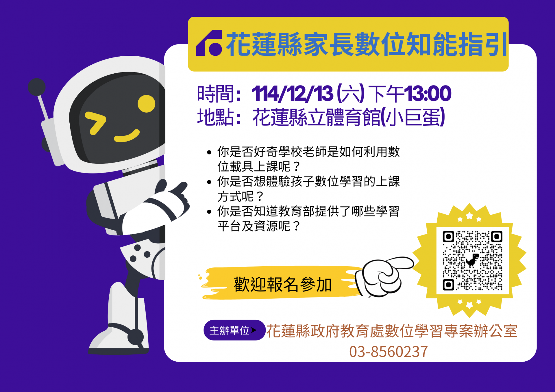 - 檢附宣導海報(含報名 QRcode),請學校轉知並鼓勵家長參與,當日提供參加者精美小禮物一份。